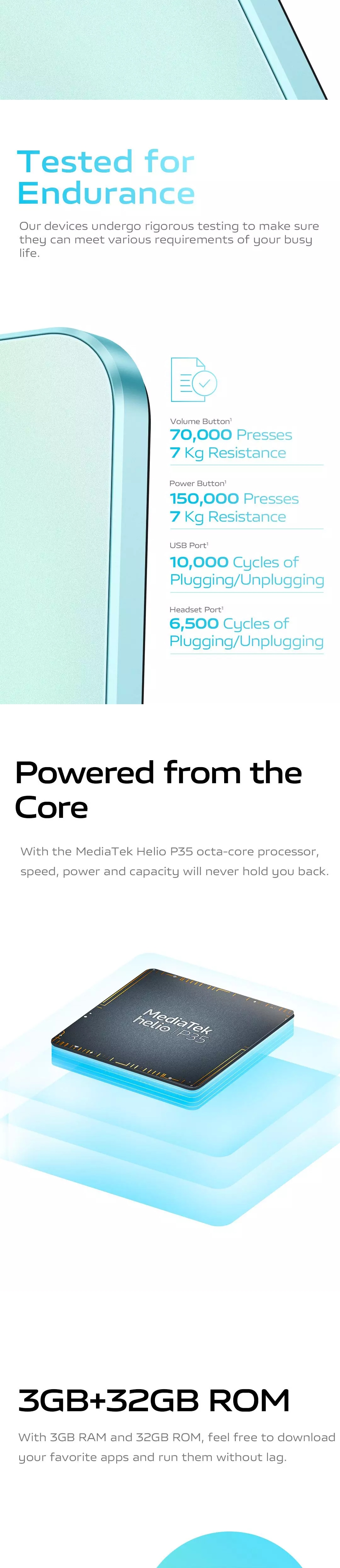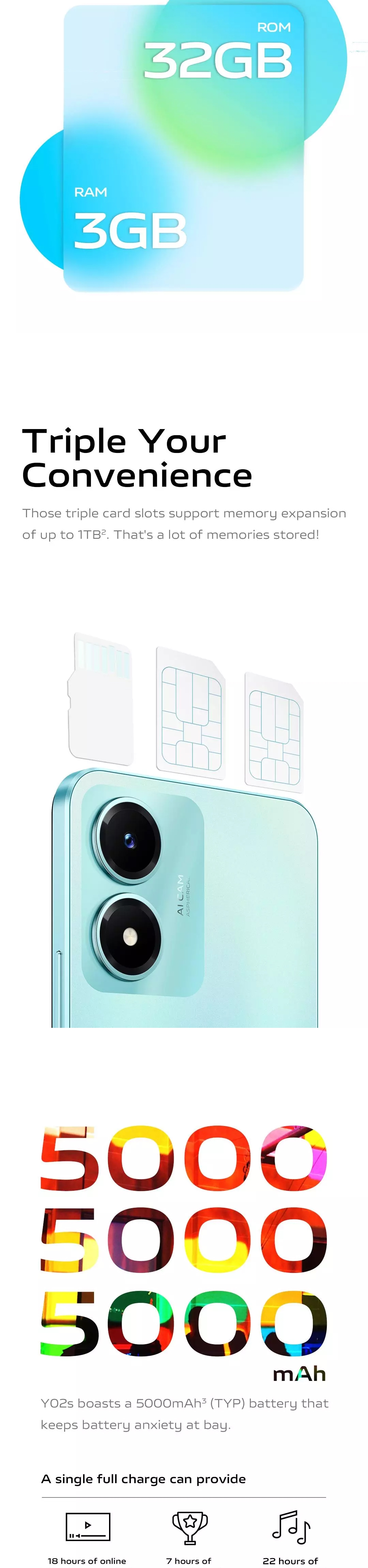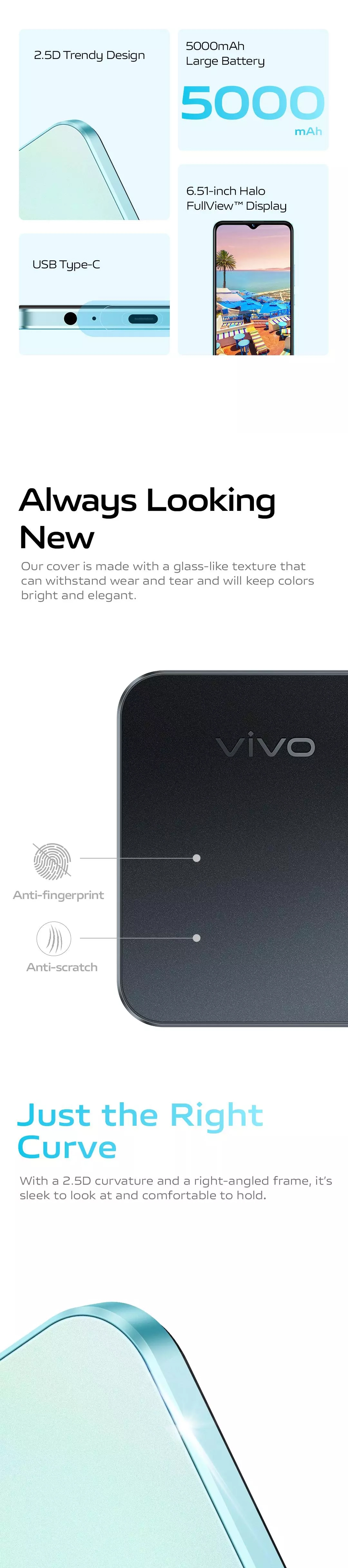 6.51-inch HD+ Halo FullView™ Display with built-in blue light filterMediaTek octa-core processor8MP rear camera5MP selfie camera3GB RAM and 32GB internal storage5000mAH batteryFREE GIFT: Vivo gift merchandise worth $29.90. While stocks last.